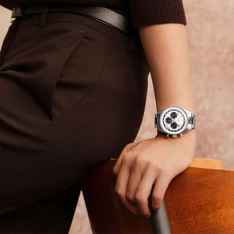 見る人を惹きつける「クロノマスター オリジナル」の新作。1970年代のプロトタイプにインスパイアされた、機能性に優れるタイムピースです。「パンダ」デザインを採用したシルバーホワイトの文字盤は、ローズゴールドプレート加工の針とマーカー、コンプリートカレンダーとムーンフェイズ表示を備えています。