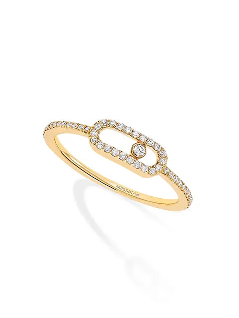 すべてが手作業、18Kイエローゴールド&ダイヤモンドの細いパヴェリング。ブリリアントカットの一粒ダイヤモンドが、パヴェをあしらったフレームの中で揺れる。「ムーヴ ウノ パヴェ リング」は、メゾン メシカを象徴する作品です。輝きに満ちた毎日へ、愛する人への贈り物。ひとつでも、または「ムーヴ ウノ」 ダイヤモンドリングと重ねて着けても。互いを引き立てあう、精緻なダイヤモンドのパヴェ。イエローゴールド&ダイヤモンドのパヴェリングが、太陽の輝きを放つゴールドを強めます。