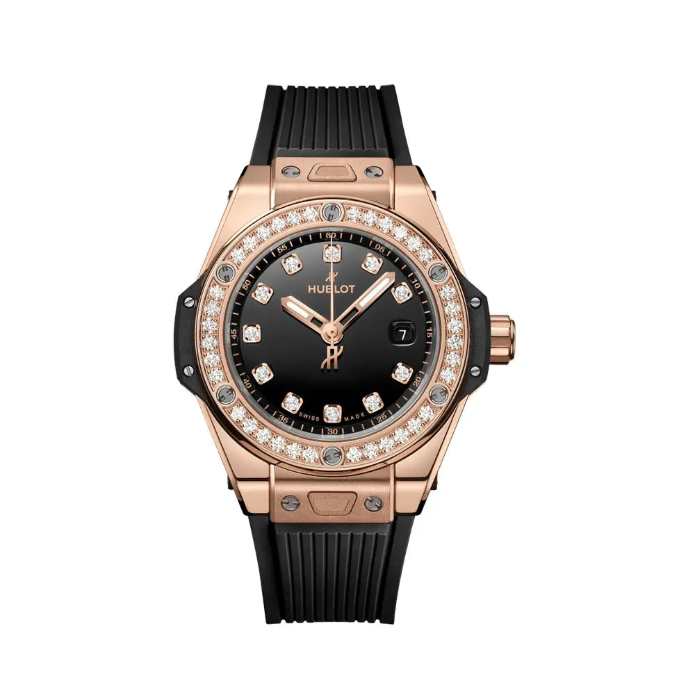 ムーブメント 自動巻き(HUB1120) ケース素材 18Kキングゴールド ベルト ラバーストラップ 防水 10気圧(100m)防水 ケースサイズ 33mm その他特徴 ベゼルに36個、インデックスに11個のダイヤモンドをセット