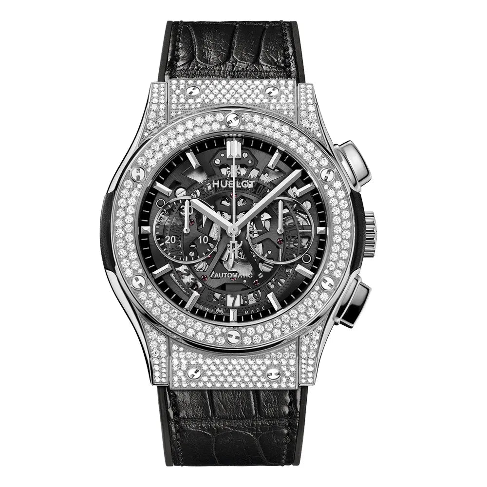 ムーブメント 自動巻きクロノグラフ(HUB1155) ケース素材 チタニウム ベルト ラバー×アリゲーターストラップ 防水 5気圧(50m)防水 ケースサイズ 45mm その他特徴 ケースに244個(1.30ct)、ベゼルに126個(1.47ct)のダイヤモンドをセット - 注意事項