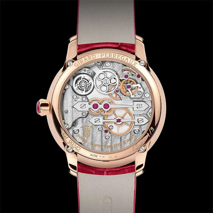 キャリバー GP09600-1620は自動巻きムーブメントで、香箱の裏側の目立たない位置にあるマイクロローターを使用します。上のブリッジは12時位置にあり、その下にある香箱は、光の反射で目を引き、魅力的にきらめく手彫りのホワイトゴールド ディスクで装飾されています。中央のブリッジの下には、時針車が見えます。下のブリッジは、文字盤の下部に配置され、トゥールビヨンにまたがっています。ジラール・ペルゴの伝統を守り、このトゥールビヨンには、竪琴形のトゥールビヨンケージが使用されています。79個の部品で構成されるこのモデルのケージの重量はわずか0.3gです。ブリッジには、サテン仕上げの側面を除く全体の鏡面ポリッシュという最高の仕上げも施されています。 - 仕様