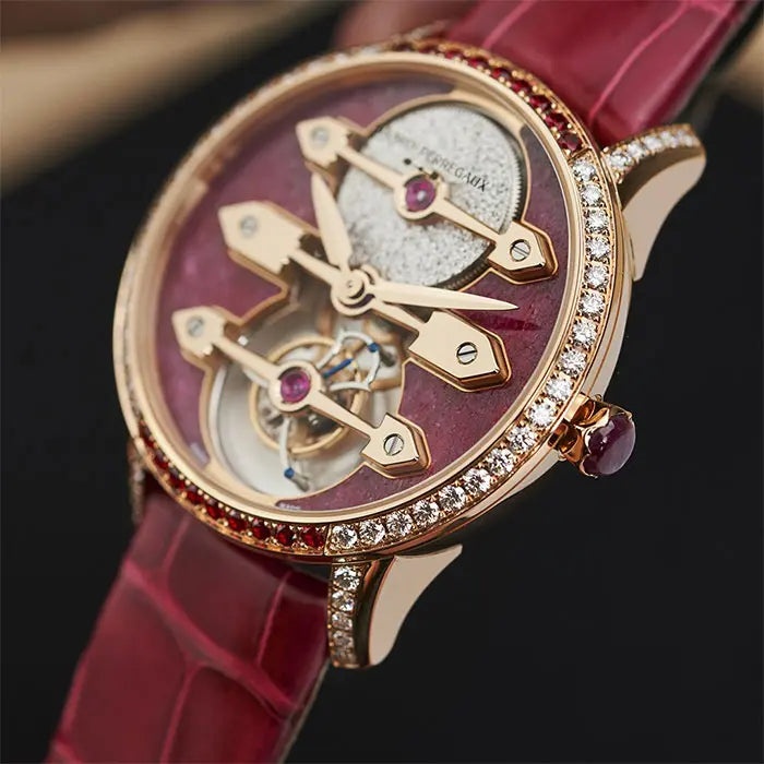 「スリー・ゴールドブリッジ トゥールビヨン ルビーハート」は、天然のルビーハートを使用したタイムピースです。このモデルは、コンスタン・ジラールとマリー・ペルゴのロマンチックな結婚に着想を得て製作されており、その仕様には、直径38mmの18Kピンクゴールド製ケースが含まれます。多くの宝石を使用し、洗練された仕上げを施したこのモデルは、情熱にあふれ、愛を象徴しています。