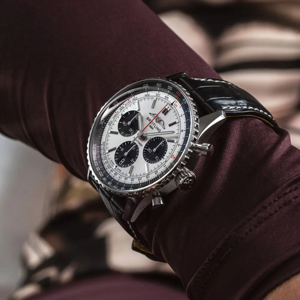 発売以来、ブライトリングのアイコンには数多くのモデルが製造されてきましたが、この新しいナビタイマーはその最もクラシックな特徴を保ちながらも、現代に即した改良を加えています。平らにした回転計算尺とドーム型クリスタルで、よりスリムな外観を実現。ポリッシュとサテン仕上げを交互に施した金属部品を採用したことで、光沢を出しつつも控えめな印象になっています。AOPAの翼が本来の12時位置に戻ったことも、ノスタルジーを喚起するアップデートと言えるでしょう。