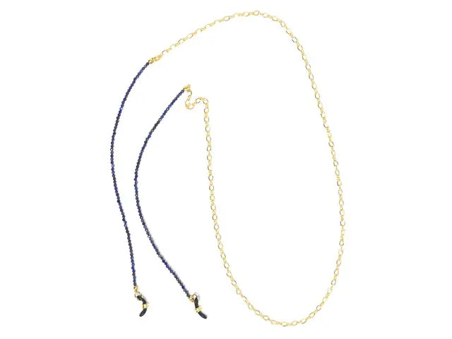 フロントサイドのメタルチェーンにはメタルパーツを通してあります。これはスライドさせる事で装着時のシルエットをコントロールする機能があり、着用時は見事なシルエットを生み出します。バックサイドはレザーになっており、色合いや質感を楽しめる上品で斬新なグラスコードです。メタルが肌に当たった時にひやっと感じる、そういった事が起きにくい構造です。