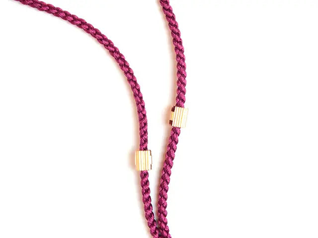 アクリルやレザーでは表現出来ない上品なツヤと柔軟さを持つ日本製のシルクコードを使用しています。コードの幅は3mmあり、他のシルクブレスコードよりもボリュームがあります。デザインのアクセントになっている筒状のパーツは場所が固定されておらず、スライドしてご自身が好む位置にデザインアクセントを設定できるようになっています。
