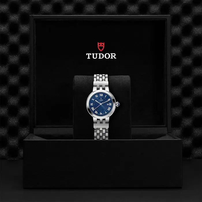 チューダーのクラシックラインである「クレア ドゥ ローズ」の名前は、フランス語で「月の光」を意味する“clair de lune” とブランドの歴史的なバラのロゴをポエティックに引用し、遊び心をくすぐるオーラを纏います。伝統の「クレア ドゥ ローズ」に、チューダーブルー ダイアルが登場。浮き彫りの繊細な装飾が施され、ローマ数字があしらわれています。