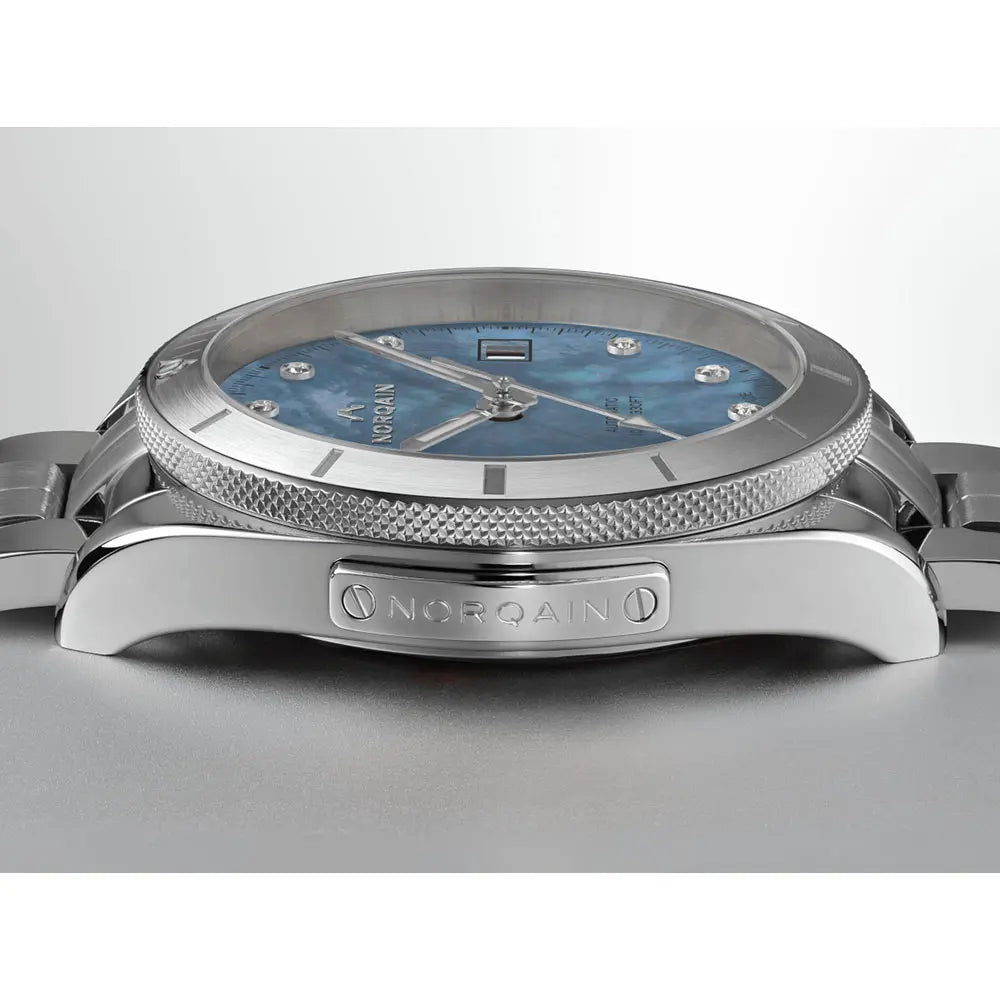 アドベンチャーコレクションの特徴は、スポーティな力強さです。製造技術の魂を込めた、精緻なローレット加工を施したベゼル、ダイアモンドインデックス、マザーオブパールの文字盤を備えます。