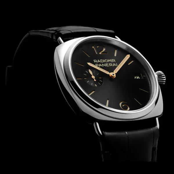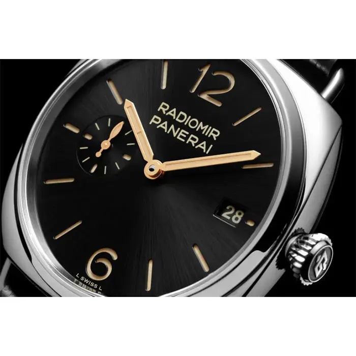 文字盤:ブラック、サンブラッシュ仕上げ、夜光アラビア数字とアワーマーカー。3時位置に日付、9時位置にスモールセコンド