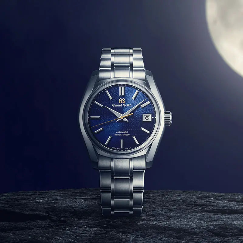 二十四節気の一つ「秋分」の頃の澄んだ夜空の美しい情景から着想を得たモデル。濃紺のダイヤルの中で際立つ金色のGSロゴと秒針によって、夜空と月のコントラストが美しい月夜のようなモデルです。