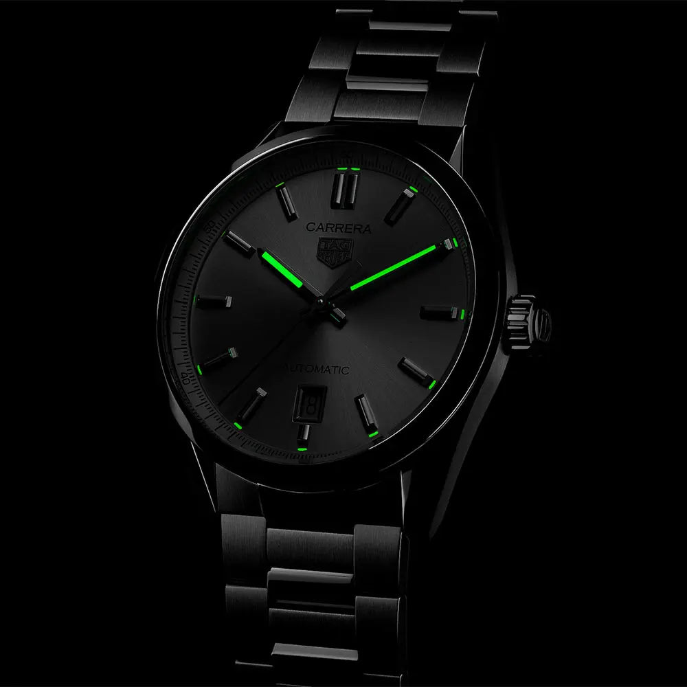 あらゆる状況に対応する「タグ・ホイヤー カレラ」。高級感あふれるシルバーサンレイ加工サテン仕上げのダイヤルには、機能的でエレガントなロジウム加工のタグ・ホイヤー ロゴ、そしてスーパールミノバ®が塗布された針とインデックスが映えます。